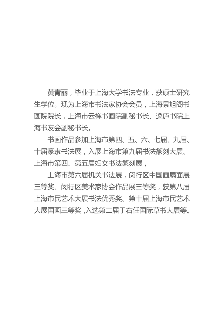 黄青丽,毕业于上海大学书法专业,获硕士研究生学位。现为上海市书法家协会会员,上海景旭阁书画院院长,上海市云禅书画院副秘书长、逸庐书院上海书友会副秘书长。